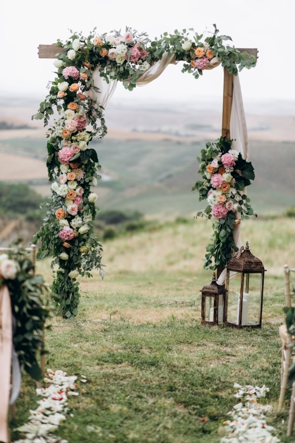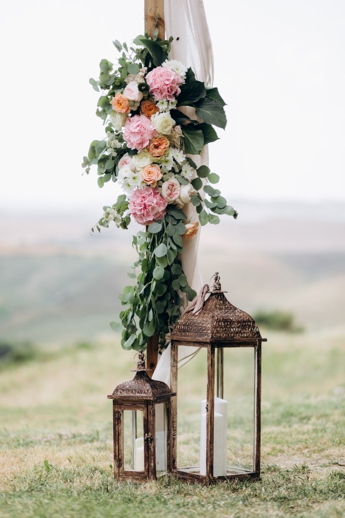 Каждая хупа оформляется индивидуально: изысканно, стильно и с учётом общей концепции свадьбы. Мы используем свежие розы, пионы, орхидеи, гортензии, эвкалипт, сезонные цветы и декоративную зелень. Композиции украшают верхние балки и опоры хупы, создавая эффект воздушности и торжественности.