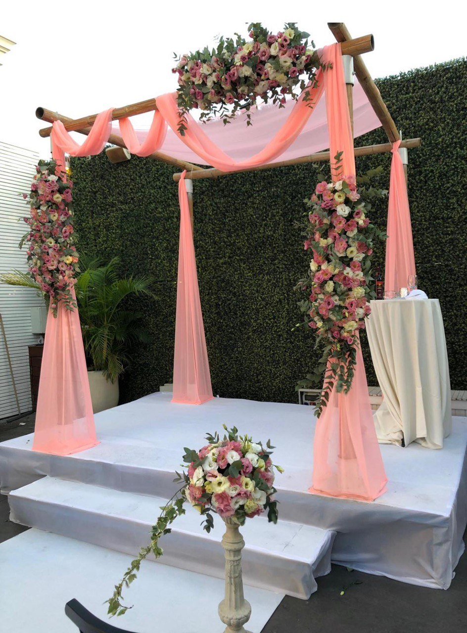 Каждая хупа оформляется индивидуально: изысканно, стильно и с учётом общей концепции свадьбы. Мы используем свежие розы, пионы, орхидеи, гортензии, эвкалипт, сезонные цветы и декоративную зелень. Композиции украшают верхние балки и опоры хупы, создавая эффект воздушности и торжественности.